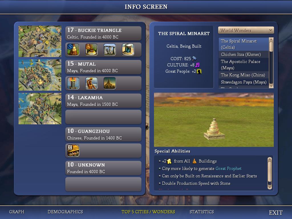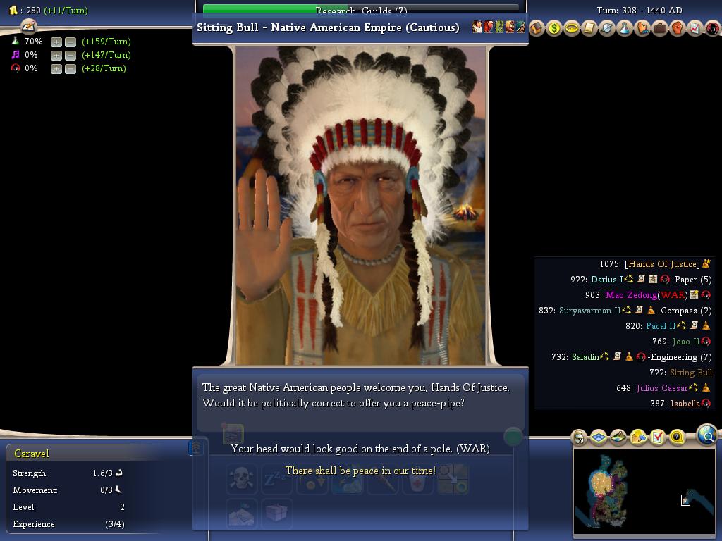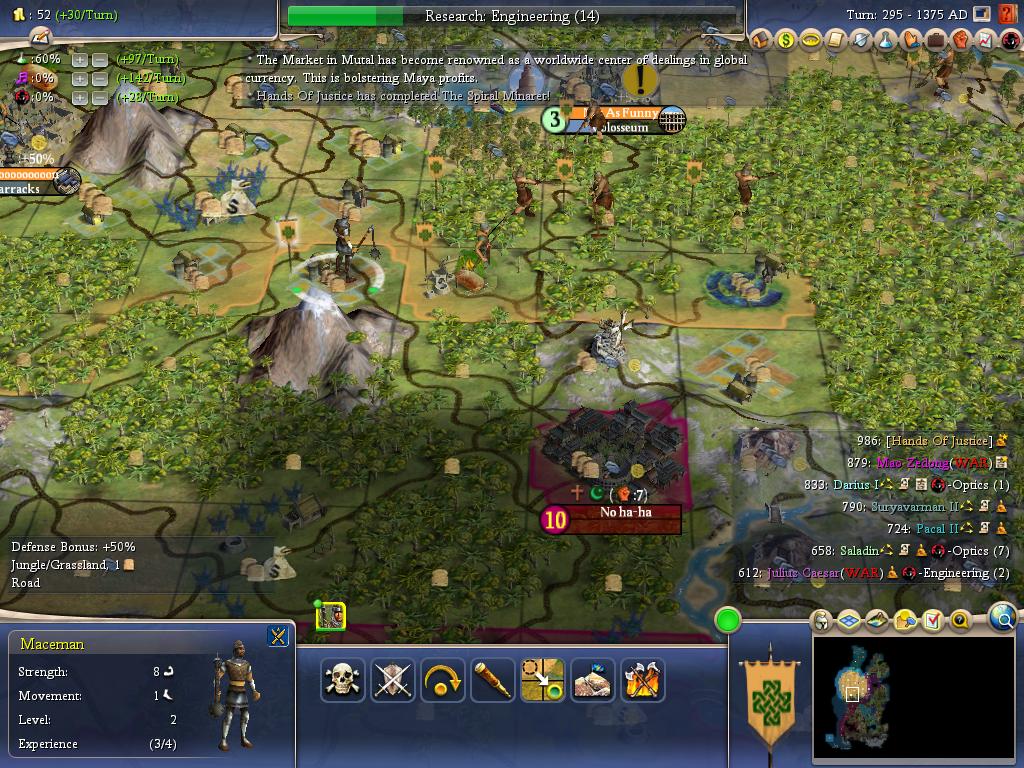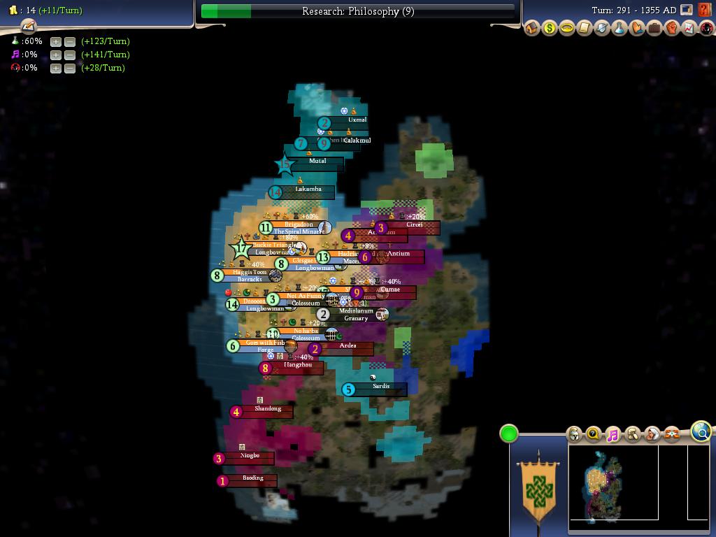 Assessing the state of the empire, Saffy3 was pleased to see that the capital was the greatest city on the continent. He also saw that the puny Mayans owned the 2nd and 3rd best cities. Once he got out of the shit he was in currently, he would have to pay them a 'visit', Saffy3 thought pleased.