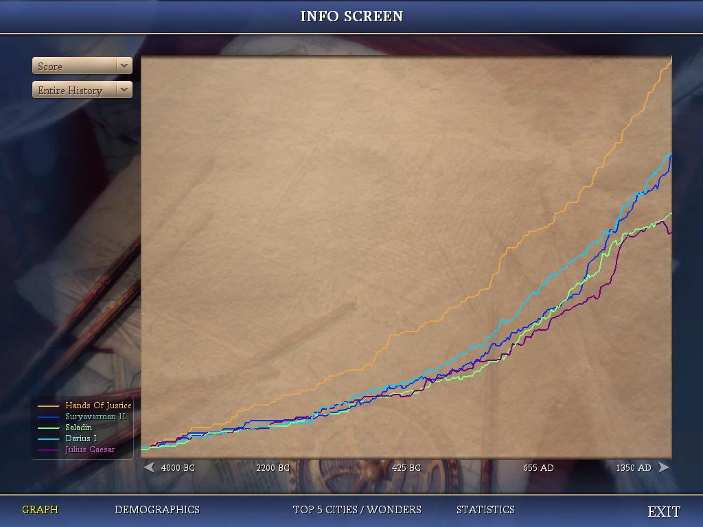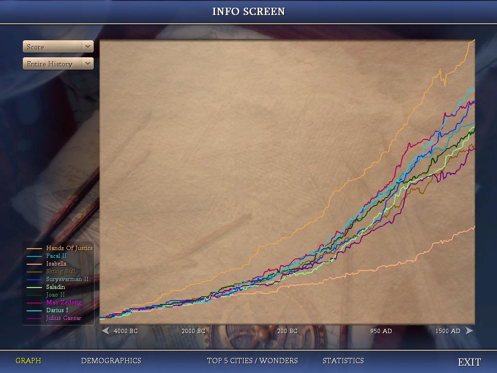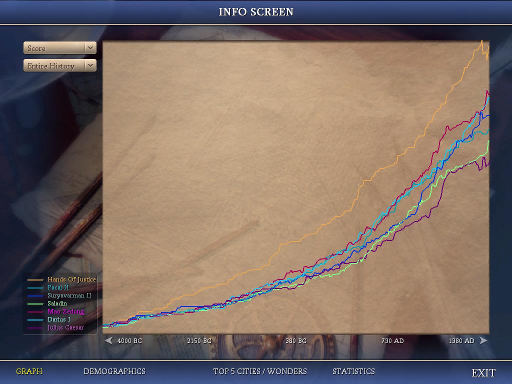 On his deathbed Saffy3 hears he's done ok regarding the circumstances. But there's still a battle to be won over the Chinese, on whom the Celts didnt take ground regarding the military. However, when total power is regarded, the Chinese are starting to fall behind. The Celts must be cautious not to loose the advantage over the other cultures though!