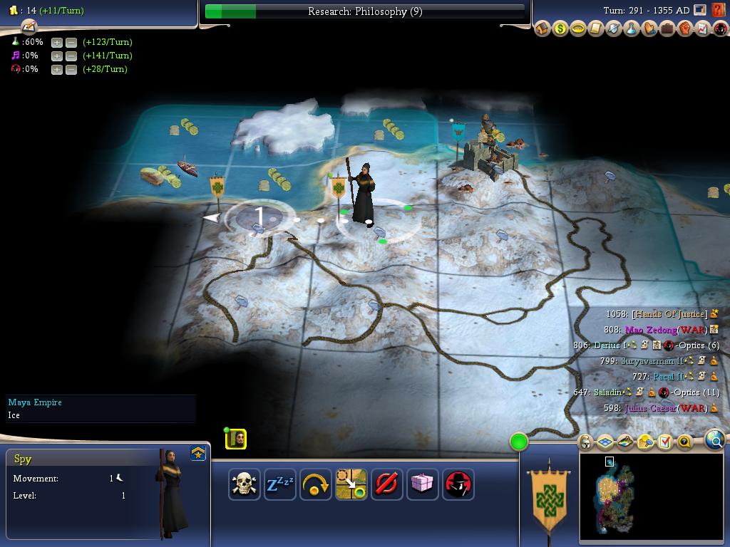 Around that time Saffy3 also called back his spy units, one of which was freezing his butt off for no sensible reason. Saffy3 was sure those spies were of much better use in the homeland, defending against enemy spies. Did Saffy2 not build them with that in mind??