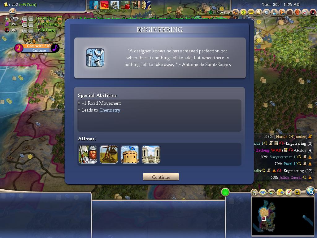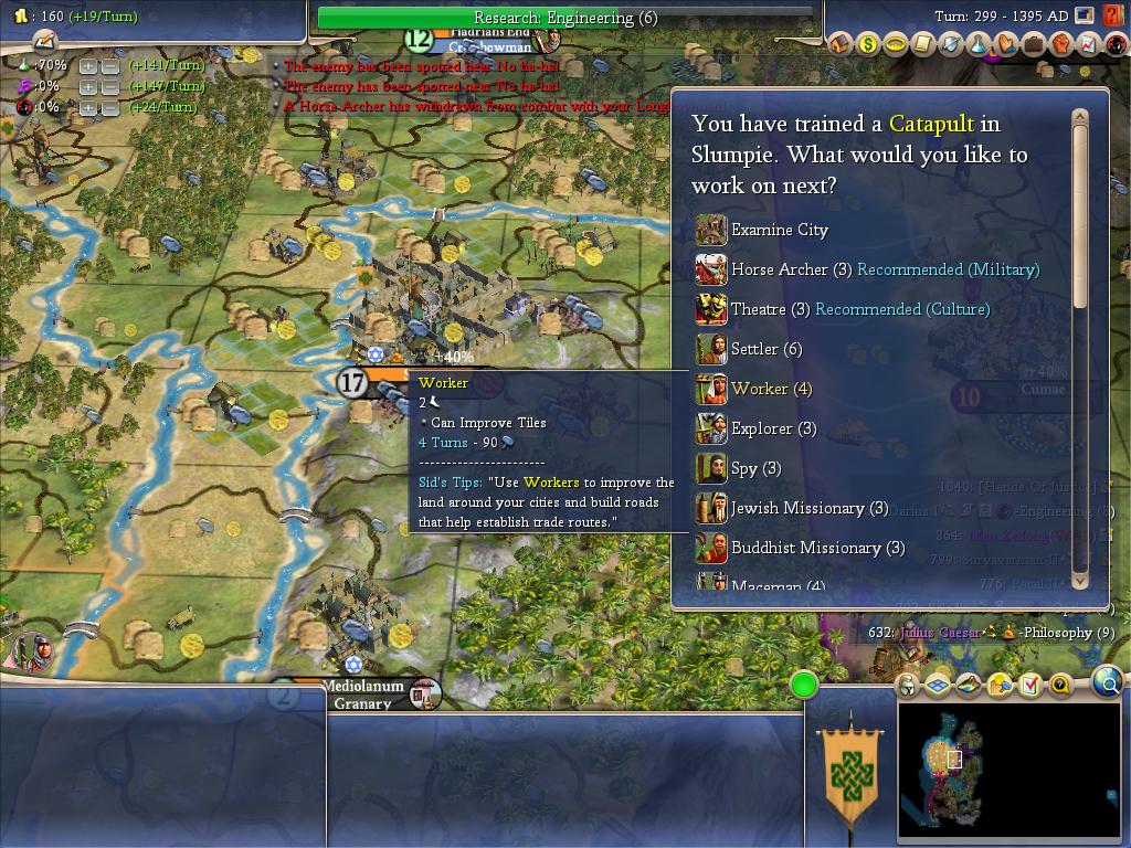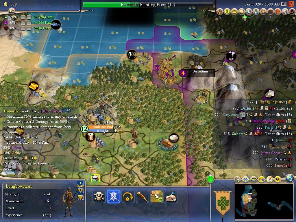 As Celt troops take up positions to take back Goes with Fish, Celtic scientists discover the principles of engineering. This will prove of great essence for the war, because now trebuchets can be build to attack cities, pikemen to better attack enemies on horseback. The improvement of the roads this means is of no less importance, as this will mean that troops can now travel to the battlefront much quicker!