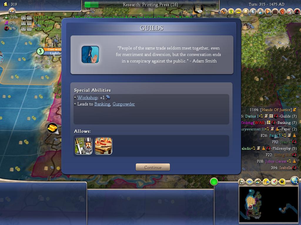 After that Saffy3 orders the development of the printing press to bolster his economy and replaceable parts to improve the empires productivity! Better economy is more army he thinks! More productivity is more army he thinks!